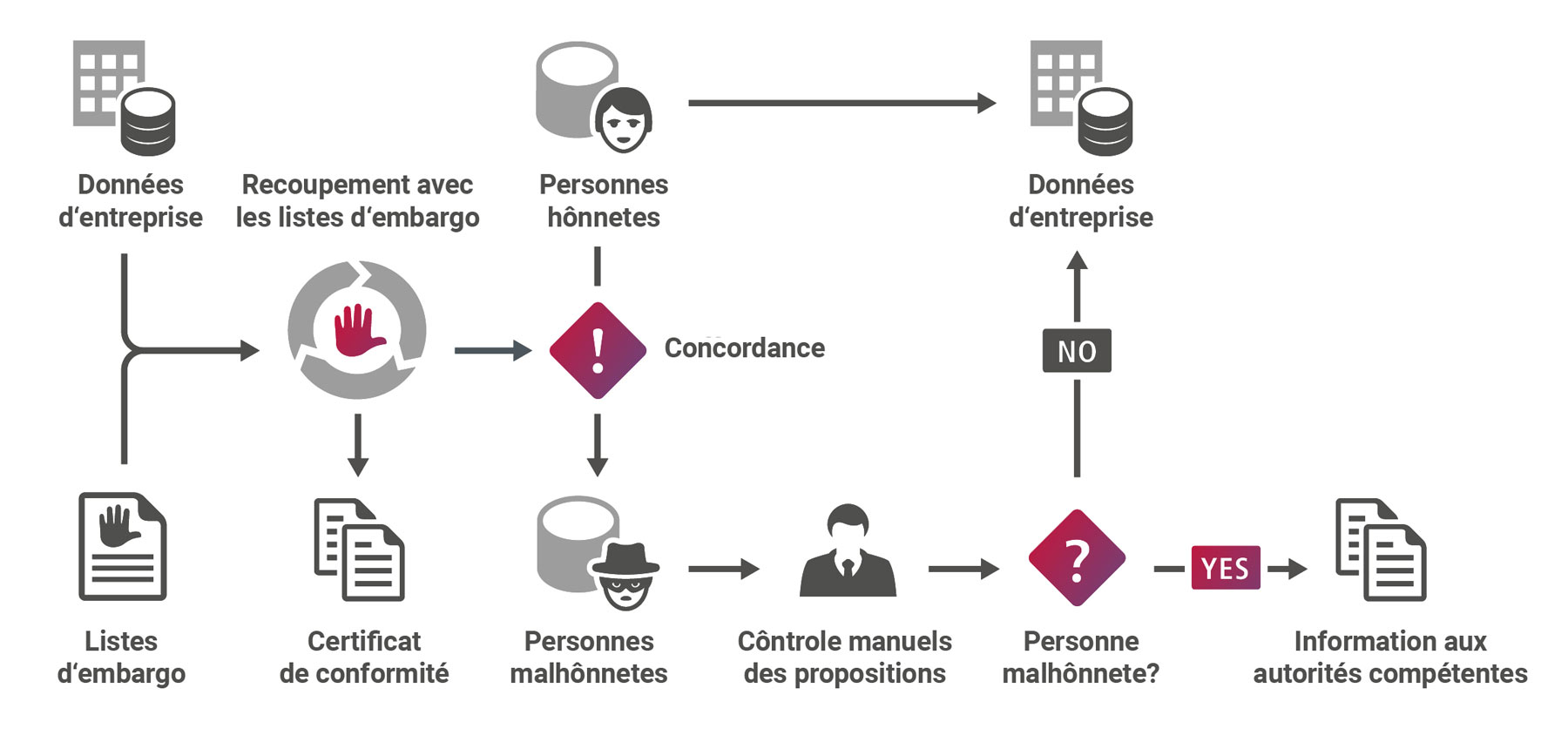 Business plus sécurisé, grâce à la comparaison des données des partenaires commerciaux avec les listes noires ou les listes d'embargo dans des bases de données de grand à très grand volume, à partir de 100 000 enregistrements. Car la conformité ne comprend pas seulement le respect des lois ou des réglementations sectorielles, mais aussi l'interdiction de transactions avec des personnes ou des entreprises suspectes.